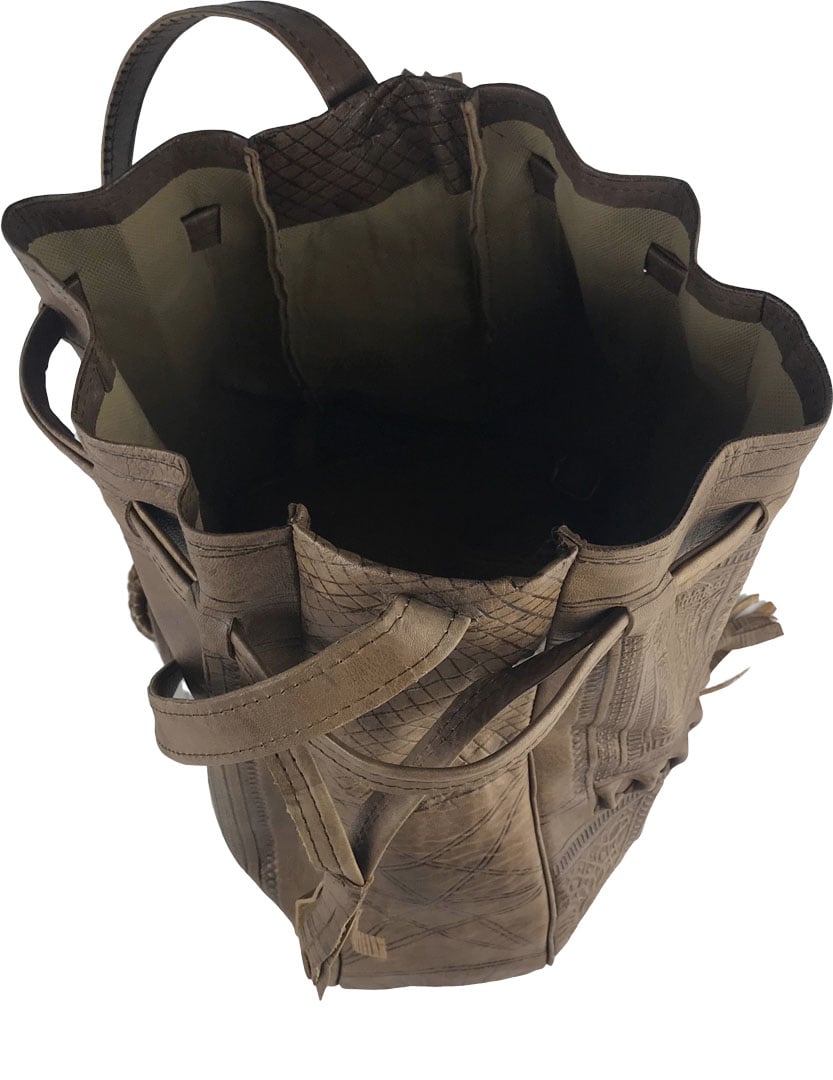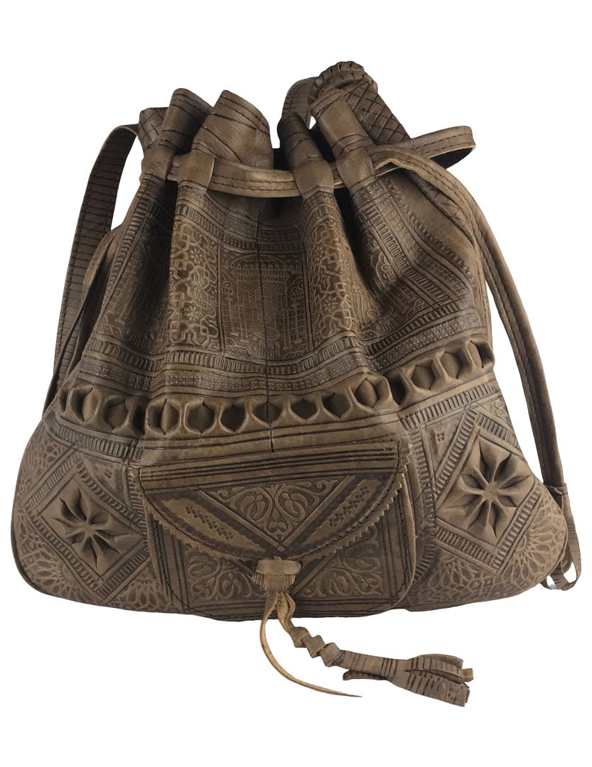 The bag is brown in color and features traditional geometric patterns engraved into the leather. It also features an adjustable shoulder strap and an exterior pocket.