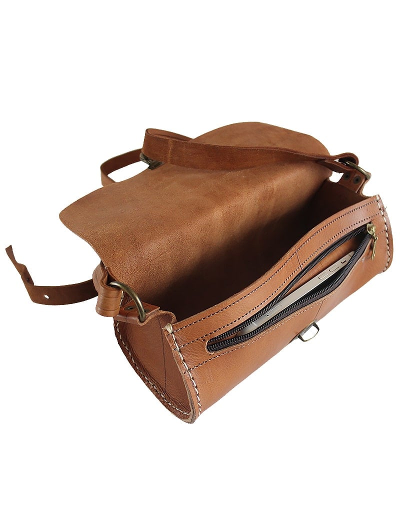 Add a touch of elegance and originality to your style with this cylinder-shaped Moroccan handcrafted leather bag.